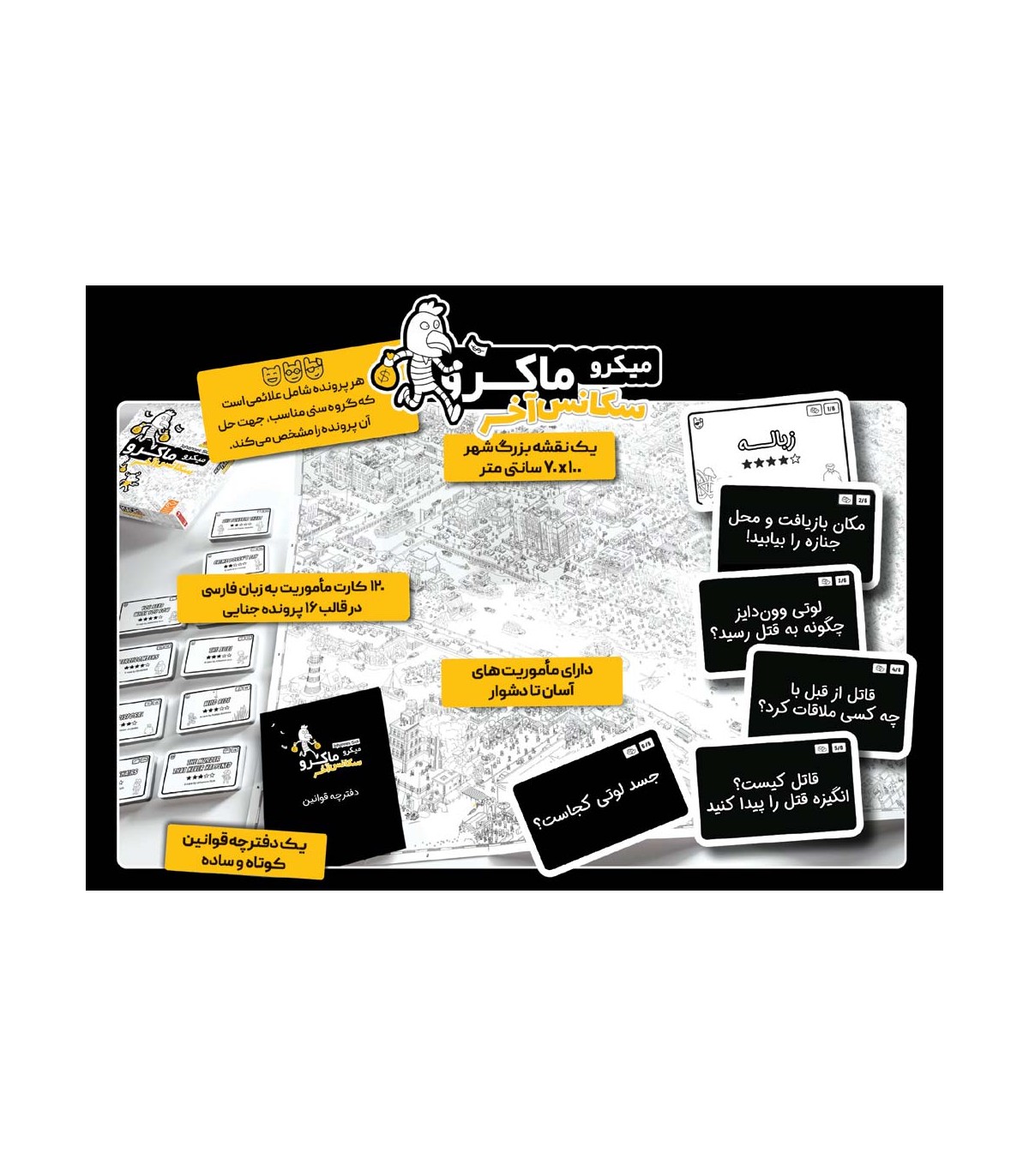 آخرین نسخه از سری جذاب میکرو ماکرو نقشه جدید و پرونده های جدید برای بازی کردن نسخه های مختلف میکرو ماکرو ترتیبی نیاز نیست! سرنخ های کوچک را برای حل پرونده های بزرگ پیدا کنید. محصول گروه : چارپایه طراح بازی : Johannes Sich برنده جایزه بهترین بازی سال دنیا در سال 2021 15 نامزدی در جوایز جهانی و برنده 5 جایزه جهانی